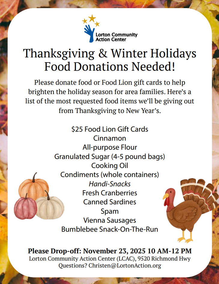 Drop off is on Sunday, November 9th, from 10:00 a.m. – 12:30 p.m. at the Lorton Community Center, 9520 Richmond Hwy.